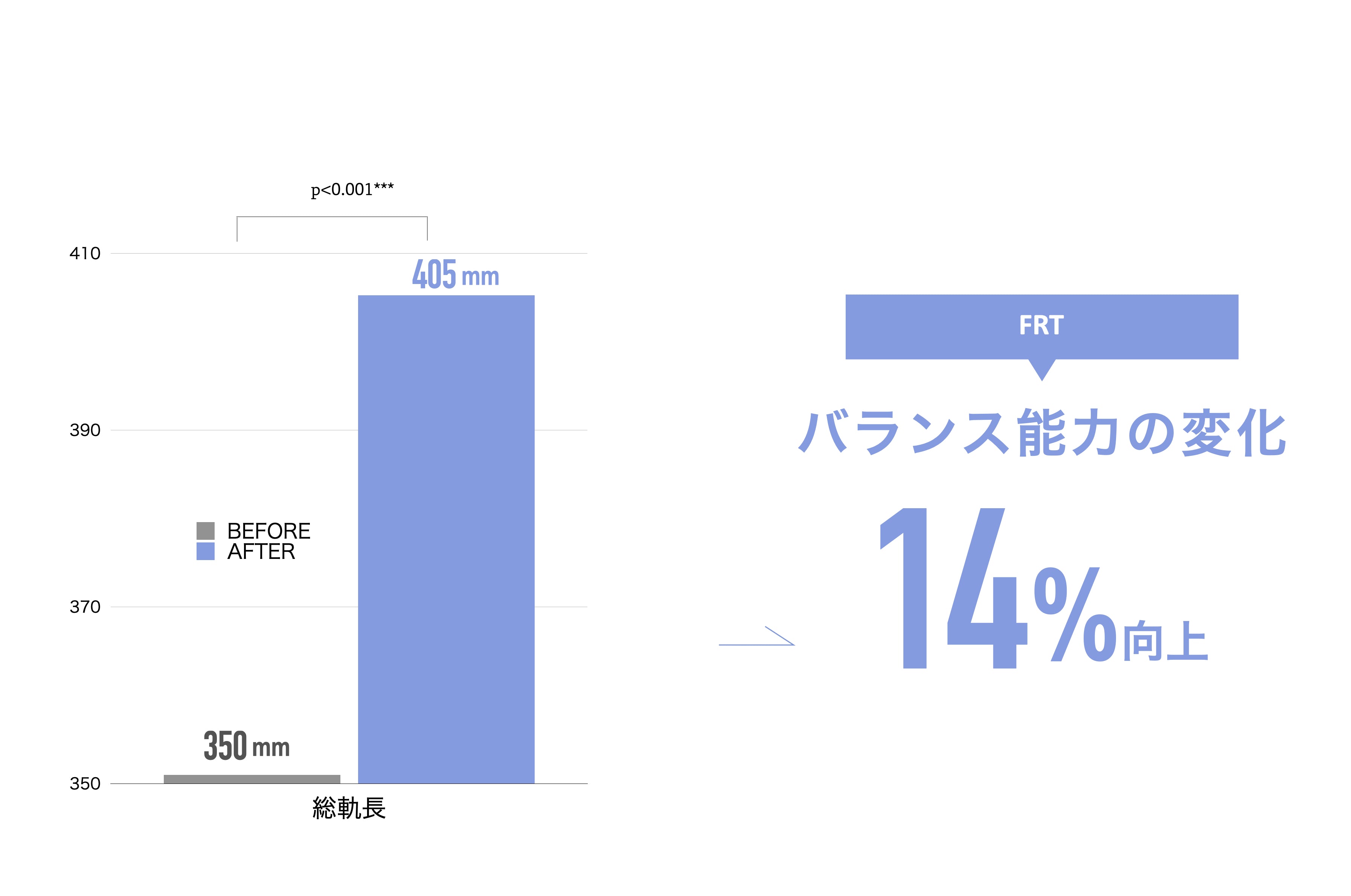 SOCKS装着後の平均値は、開始時と比べて、前方リーチ距離が14%改善。転倒予防の作用が確認されました。