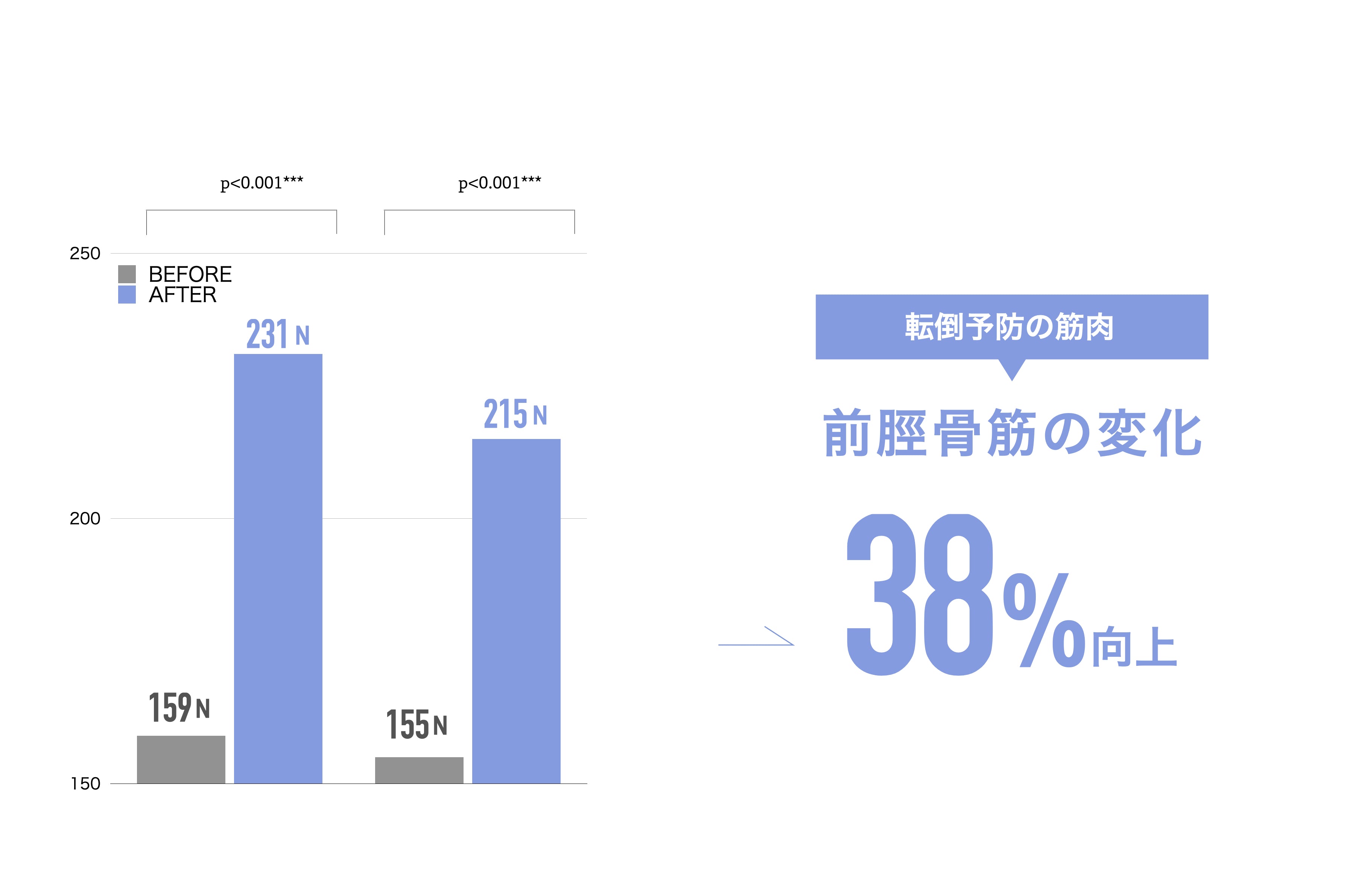 SOCKS装着後の平均値は、開始時と比べて、前脛骨筋が最大38%向上。転倒予防の作用が確認されました。
