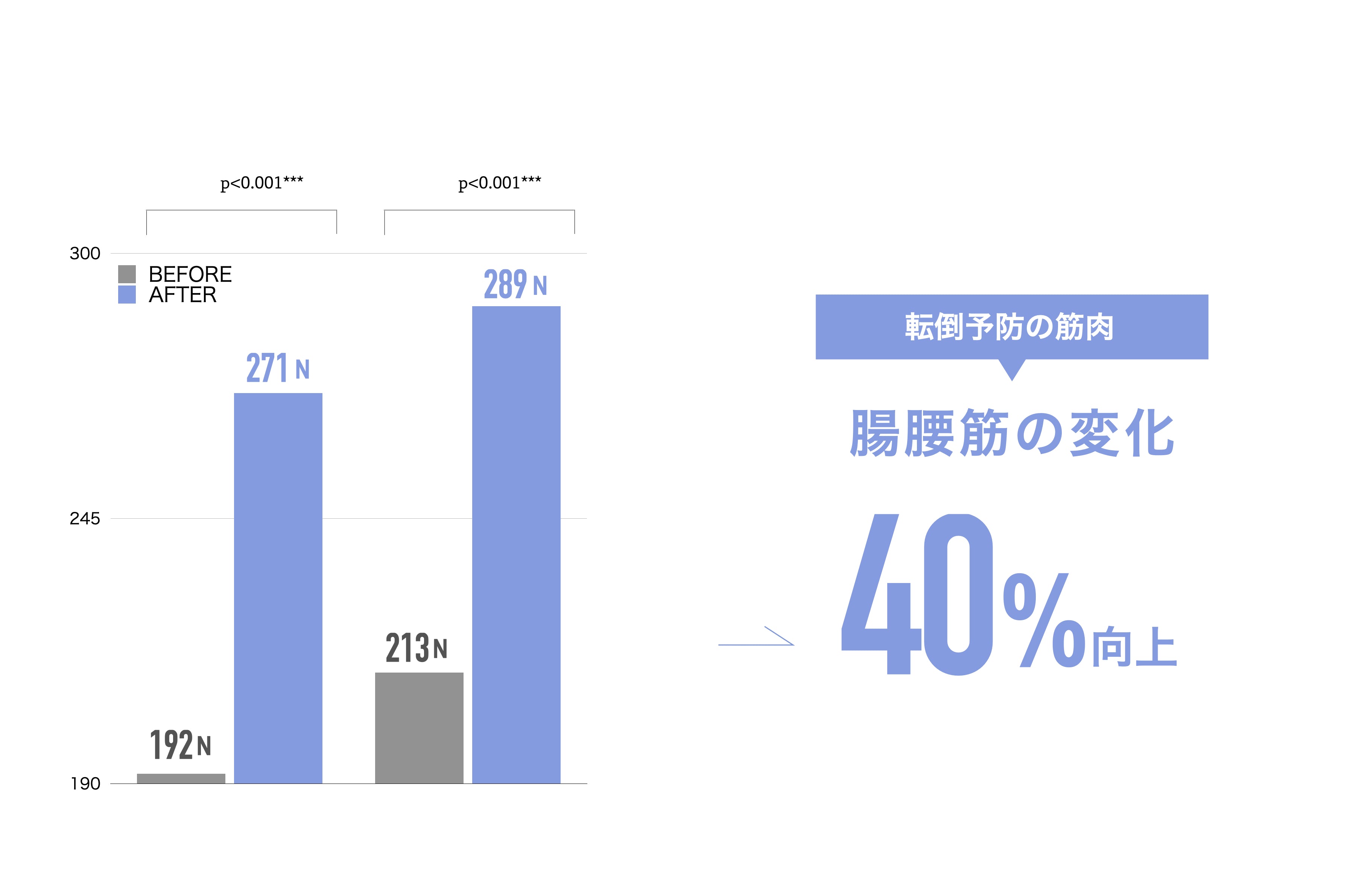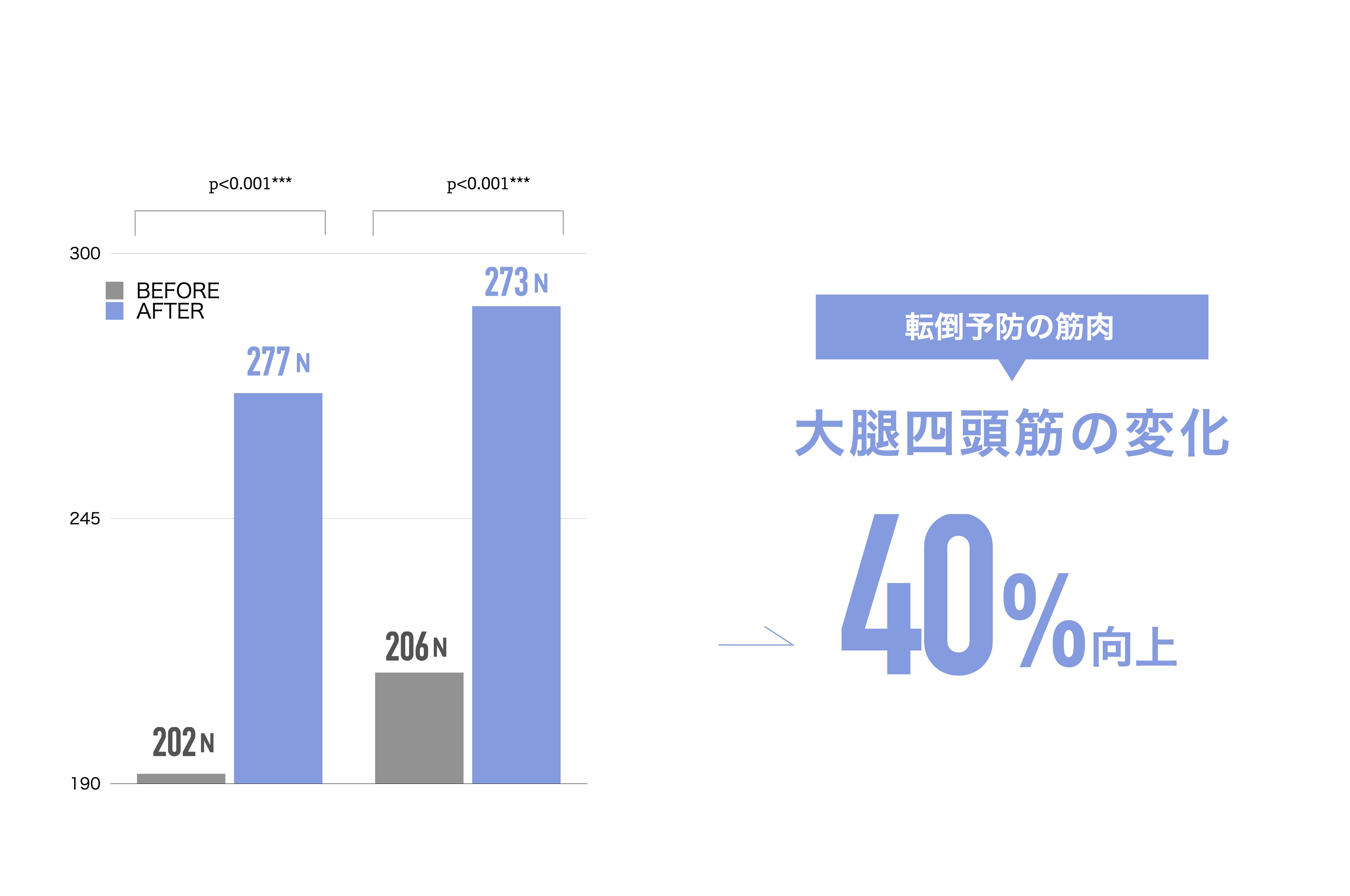 SOCKS装着後の平均値は、開始時と比べて、大腿四頭筋力が40%向上。