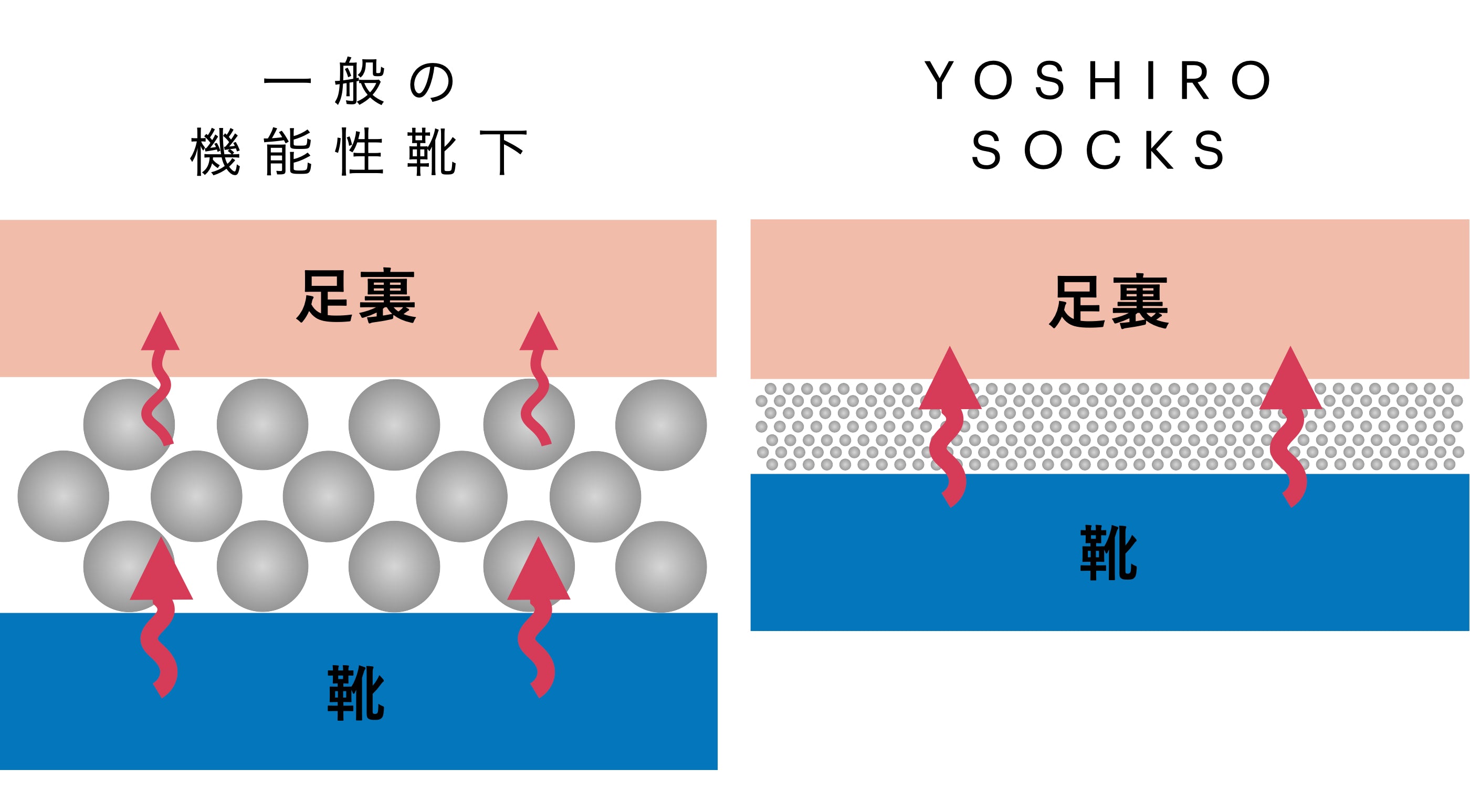 YOSHIRO SOCKSは、一般的な機能性ソックスの約5mmという厚みに対し、わずか約2mmという極薄構造。にもかかわらず、その密度と構造によって驚くほどのグリップ性能と補正力を発揮します。足と靴の間に“何かを履いている”という違和感がなく、まるで素足で履いているかのような一体感。薄さの中に、快適性と機能性を同居させた、新しい履き心地の基準です。